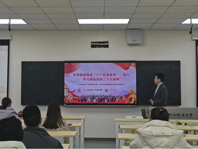 为扎实推进学习贯彻习近平新时代中国特色社会主义思想主题教育,深刻领悟党的二十大精神,加强学生党员理想信念教育,11月15日,成人论坛 、法律硕士教育学院第二十九学生党支部副书记马志龙同志以“学深悟透做实‘六个必须坚持’,深入学习领会党的二十大精神”为主题,在雁塔校区三号教学楼3606教室为支部党员讲授专题党课,党支部全体党员参加活动。
