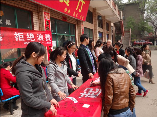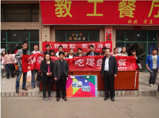活动伊始,活动组织方通过形式多样的横幅、展板和爱心卡片等向大家宣传“成由勤俭败由奢,倡导光盘净餐桌”的勤俭节约观念,号召同学们培养良好的勤俭节约意识和习惯。同时,活动组织方还于餐厅张贴精美的光盘活动倡议桌贴,向就餐者亲切赠送爱心卡片,并签名活动贯穿活动始终。活动现场气氛热烈,在场师生积极响应,踊跃参与。12点15分,学院的各位老师来到活动现场,并在倡议横幅上签名,与同学们合影留念,并身体力行,与同学们一同就餐,以实际行动倡导节俭、反对浪费。