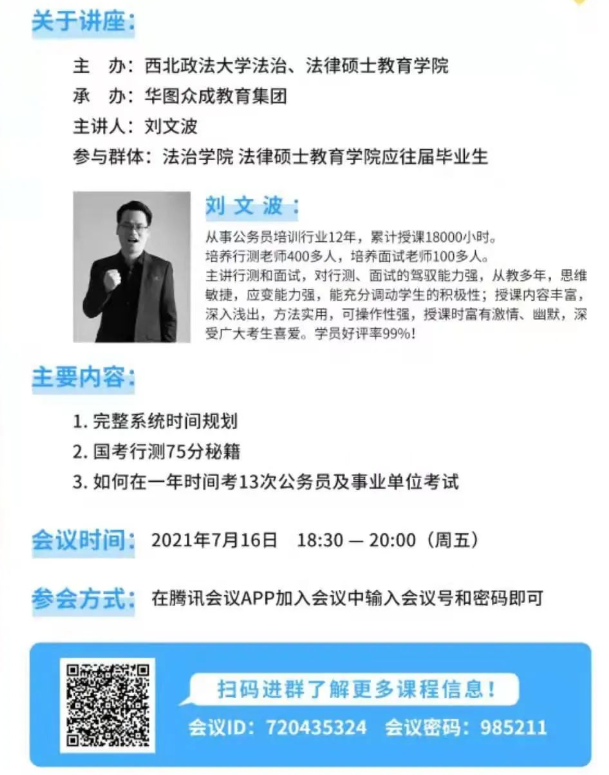 为扎实推进党史学习教育,切实落实“我为群众办实事”实践活动要求,助力广大学生公考,7 月16 日下午18:30,成人论坛 与华图众成联合举办公考讲座,旨在通过构建优质平台,介绍优质课程,提升就业质量。讲座以线上会议的方式进行,广大有意向参加公考的同学通过腾讯会议参加,讲座受到了同学们的热烈欢迎,同学们反应热烈,踊跃参与。