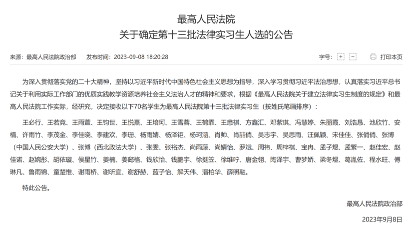 近日,最高人民法院公布了第十三批法律实习生人选名单,成人论坛 有3名研究生成功入选,分别是法学理论专业2021级硕士研究生王雪蓉、法律(法学)专业2022级硕士研究生赵佳宏、法律(法学)专业2022级硕士研究生蓝子怡。