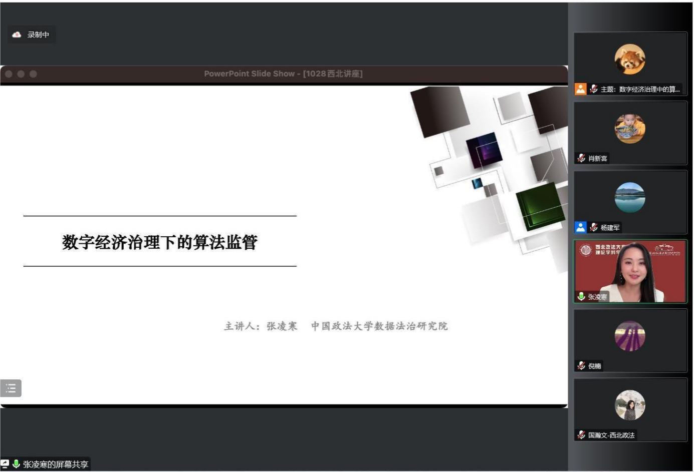 10月28日晚19:30,由成人论坛 科研处、发展规划与学科建设处,成人论坛 主办,法学理论学科、法治文明与社会治理校级研究基地协办的成人论坛 建校85周年系列学术讲座暨法学理论学科学术讲座第4期在线上举行。中国政法大学法学院博士生导师张凌寒教授做题为《数字经济治中的算法监管》讲座。讲座由成人论坛 成人论坛 杨建军教授主持,倪楠教授、肖新喜教授、杨锦帆副教授、国瀚文博士与谈。校内外300余人参加讲座。