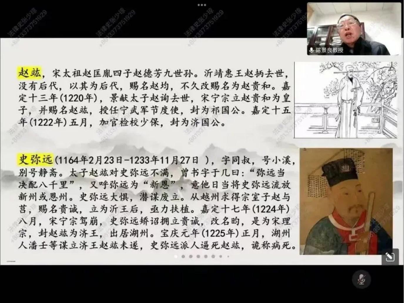 其次,在接下来的讲述中老师通过比较法律的古今异同,探讨宋代的法制与司法运作的文化原理,提出像宋代的“道理最大“的民本思想亦可与现代的理念相接榫的观点。并通过刘子健先生的著作《中国转向内在》中“皇权并不必然意味着专制”的观点从而引出在对宋理宗是否懂法这个问题讨论的同时,讨论皇权与法制的关系。在讲述的过程中,陈教授列举众多史料详细的阐述了宋理宗的生平以及相关的主要人物,例如赵竑、史弥远。