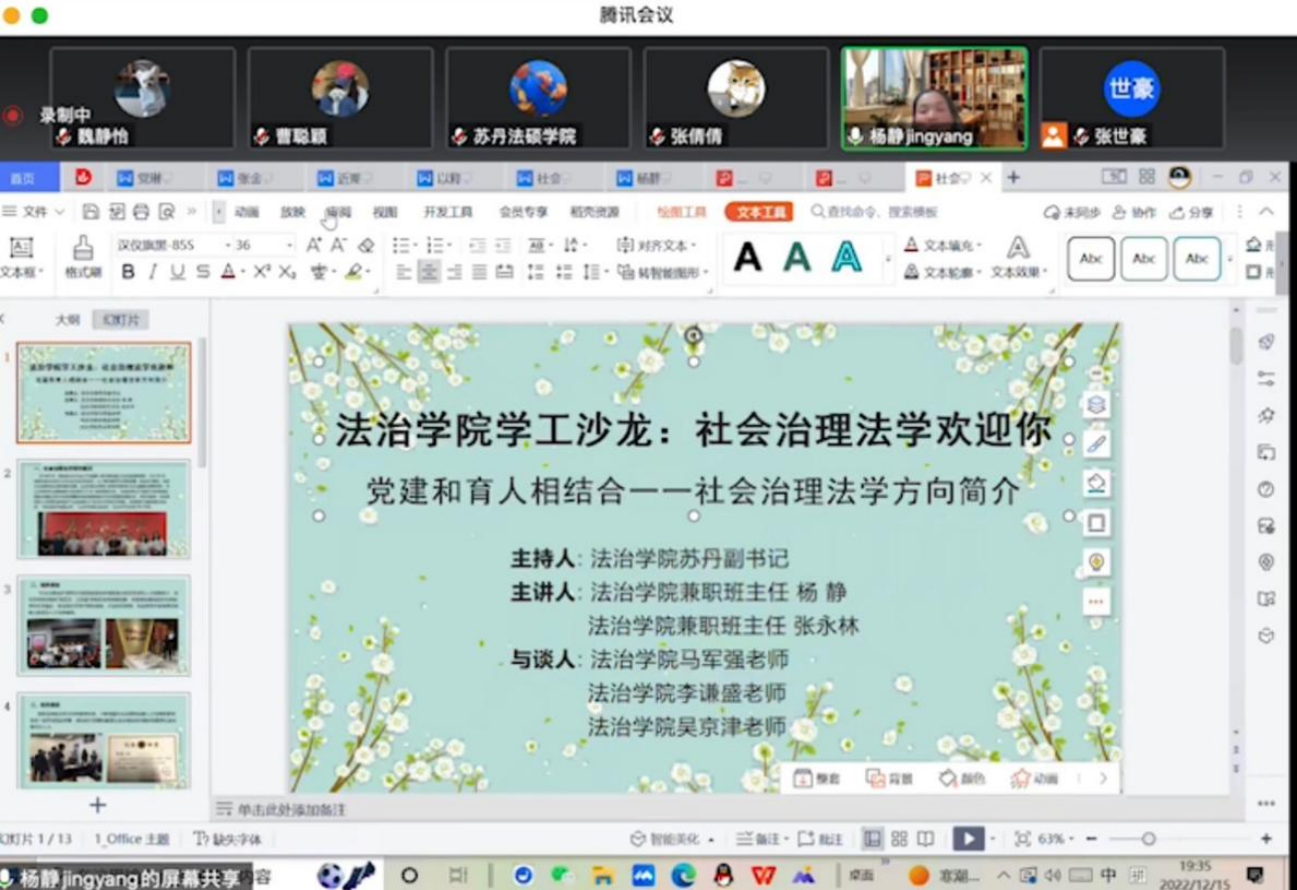 2022年12月15日晚上,成人论坛 成人论坛 举办的学工沙龙在线上顺利进行,活动主题为党建与育人相结合——社会治理法学欢迎你”。成人论坛 副书记苏丹老师魏活动致辞并担任主持人,成人论坛 兼职班主任杨静老师、张永林老师担任主讲人,成人论坛 马军强老师、李谦盛老师、吴京津老师作为与谈人,我院50余名一年级法律硕士人参加线上会议。