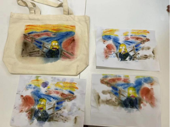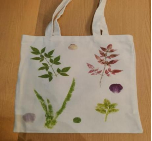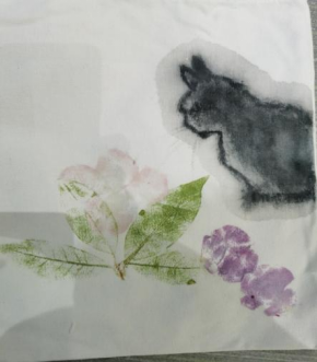 在手绘正式开始前,晓明老师还为同学们讲解了主要的构图技巧,并引导同学们进行积极的尝试。活动过程中,晓明老师悉心指导同学们在布袋上绘画,并给出建议。本次活动为大家提供了布袋、工具锤、胶带、水粉颜料、绘图工具等材料,同学们自由选择绘画材料以及拓印植物,制作了专属于自己的精美布袋。