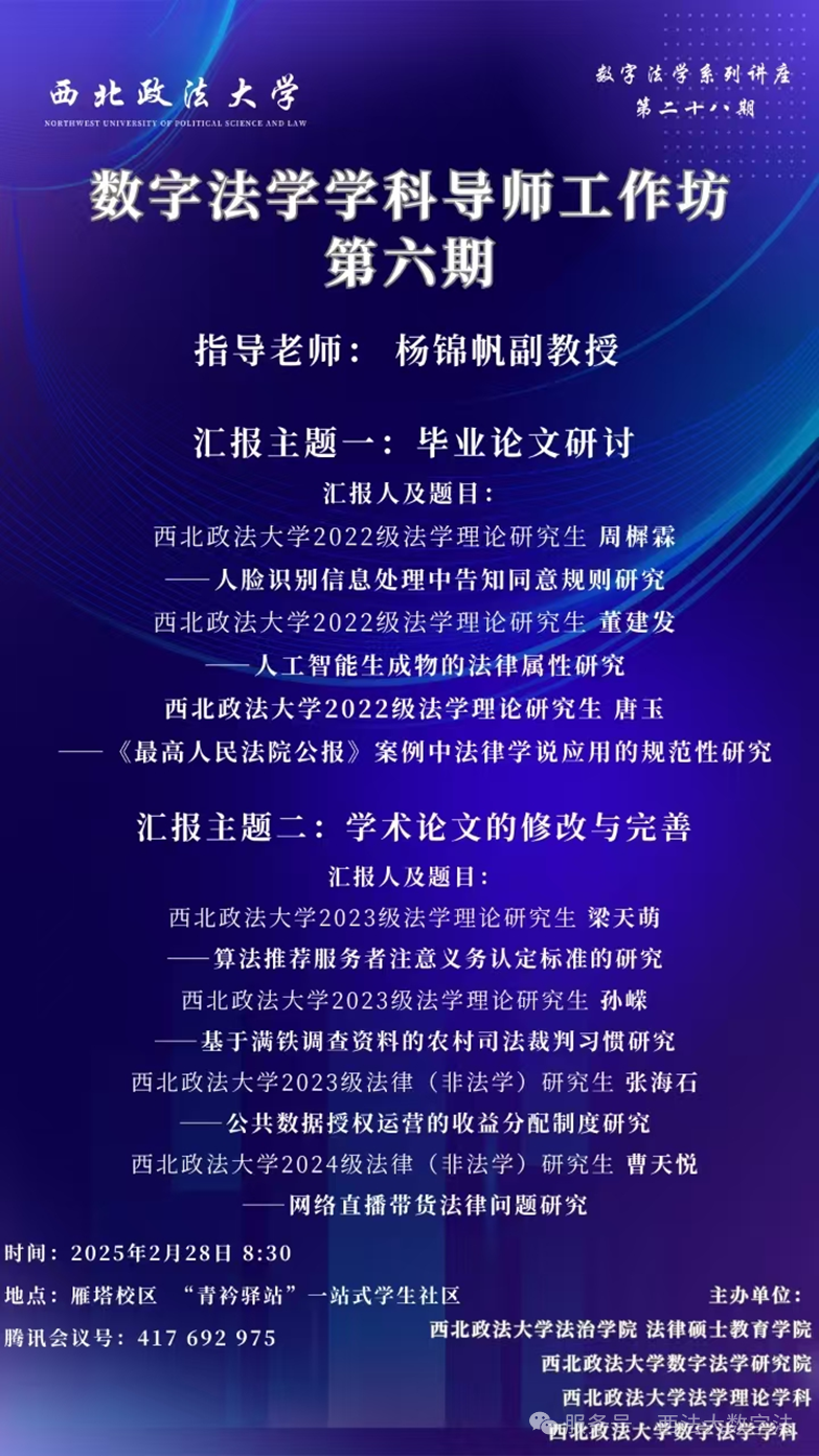2025年2月28日,成人论坛 成人论坛 法学理论专业数字法学方向师生于七号公寓“青衿驿站”举行了论文研讨会,成人论坛 杨锦帆老师和法学理论专业、大数据与人工智能法治方向的部分研究生同学参加了本次论文研讨会。