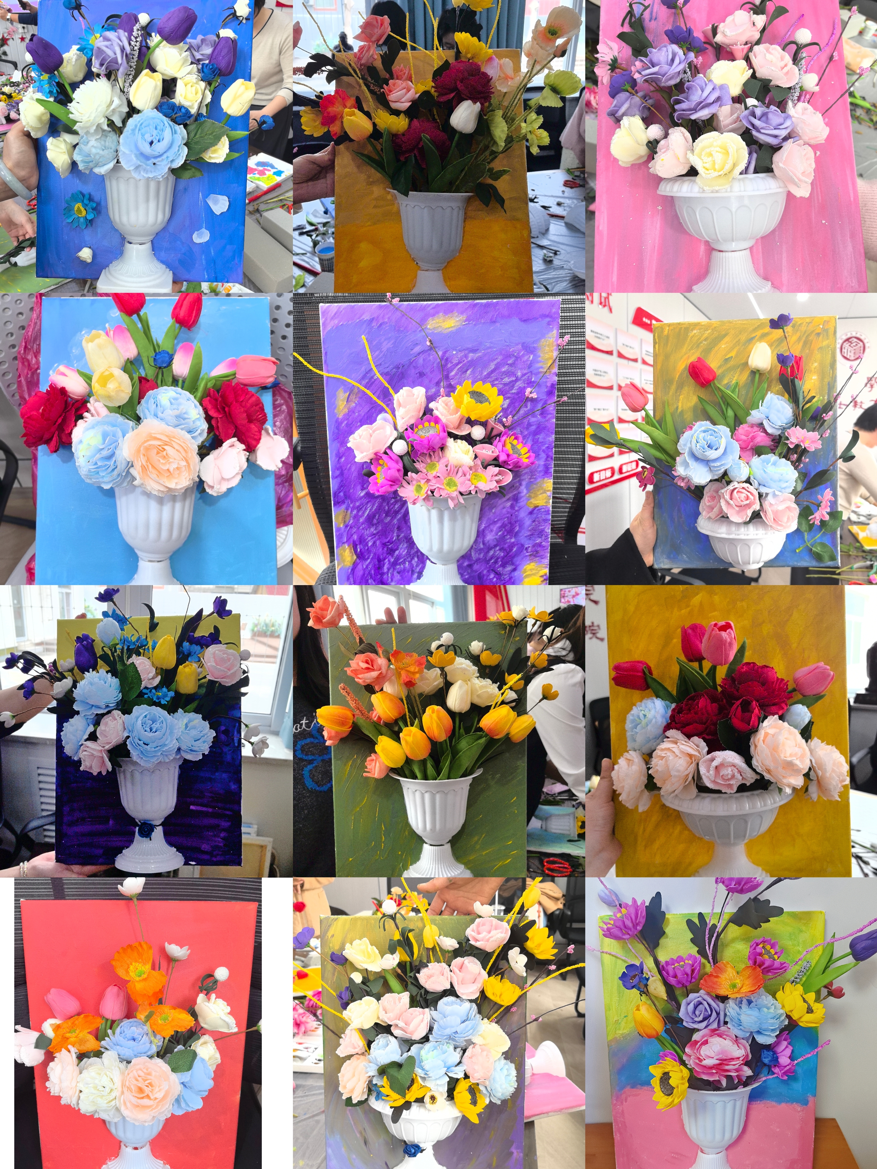 现场气氛热烈,老师们认真听讲、精心创作。活动准备了各类花卉、花瓶模具、油画框、颜料等丰富物品,为创作提供充足支持。在艺术的世界里,老师们暂时忘却工作的疲惫,沉浸在绘画的乐趣中,用画笔描绘出心中的美好。