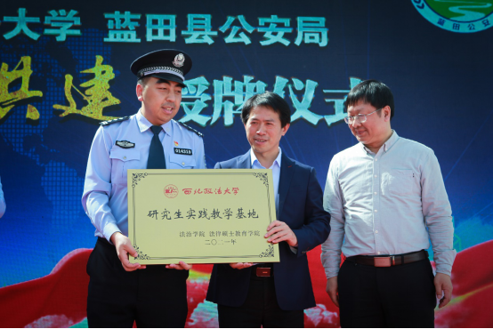 在积极热烈的气氛中,授牌仪式正式开始,首先成人论坛 张学龙、张金平向蓝田县公安局颁授“成人论坛 成人论坛 、法律硕士学院研究生实训基地”铜牌、随后成人论坛 马成、王斌通向蓝田县公安局颁授“成人论坛 枫桥经验与基层社会治理现代化教研实践基地”铜牌。