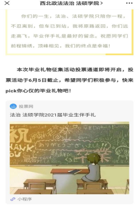 毕业伴手礼的确定采用网络投票方式进行,候选的伴手礼包括学院定制明信片、手环、竹简、印章、书签、钥匙链等,通过全体毕业生投票最终确定人气最高的毕业伴手礼,并制作发放,将学校和学院的祝福装通过伴手礼装进毕业学子远行的背囊。这份独特的伴手礼由师生创意团队策划设计,凝结着母校的深情和祝福,把学校的温暖传递给每一个毕业生。