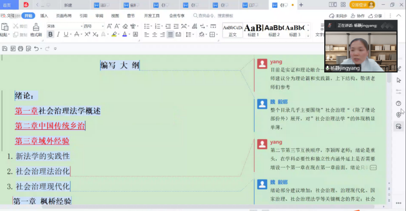 7月21日下午与27日晚上,成人论坛 以线上线下相结合的形式召开了由法治与国家治理研究室具体负责《社会治理法学》教材编写研讨会。成人论坛 汪世荣教授,张金平教授,褚宸舸教授、王斌通博士、杨静博士、张永林博士、徐海俊博士、鲁肖麟博士、马瑞丰博士和特邀校内专家郑文副教授、魏毅娜博士、李颖晖博士一起参与研讨。